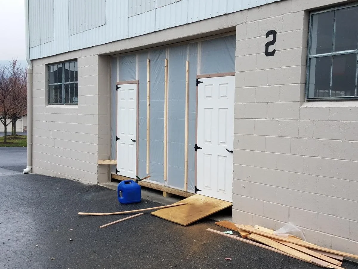 Also, since the wedding was taking place right here at Homestead, there was plenty to do! In the days leading up to the event, one of our storage bays was completely cleaned out, basic flooring and carpets laid and impromptu walls and doors installed where the garage doors normally were. (So that we didn’t have to leave the garage doors up and freeze everyone out!). Pretty convenient to have a shop full of talented builders right on site to help with the wedding prep! They worked hard to get the place ready to host everyone.
